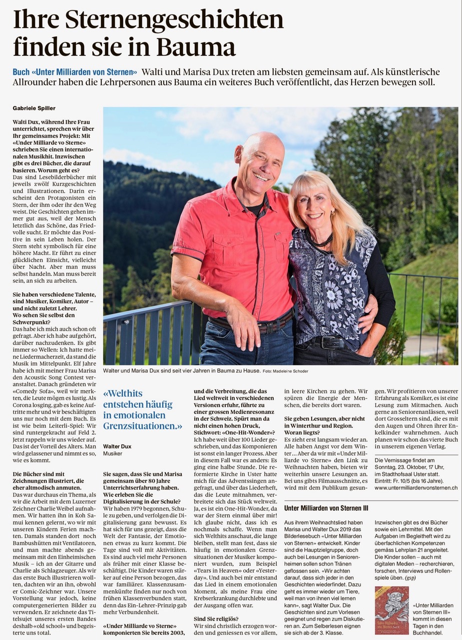 “Unter Milliarden von Sternen” has already made its way into Swiss schools. In collaboration with the teaching materials publisher of the Canton of Zurich (ZKM), Marisa and Walti Dux created a reading companion booklet to accompany their book. The publisher’s long-standing editor commented on this work: